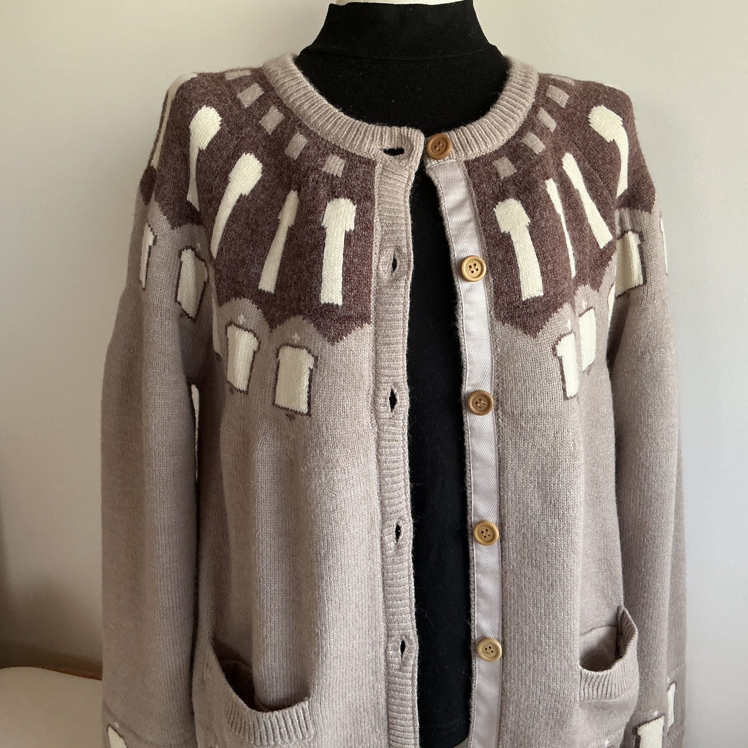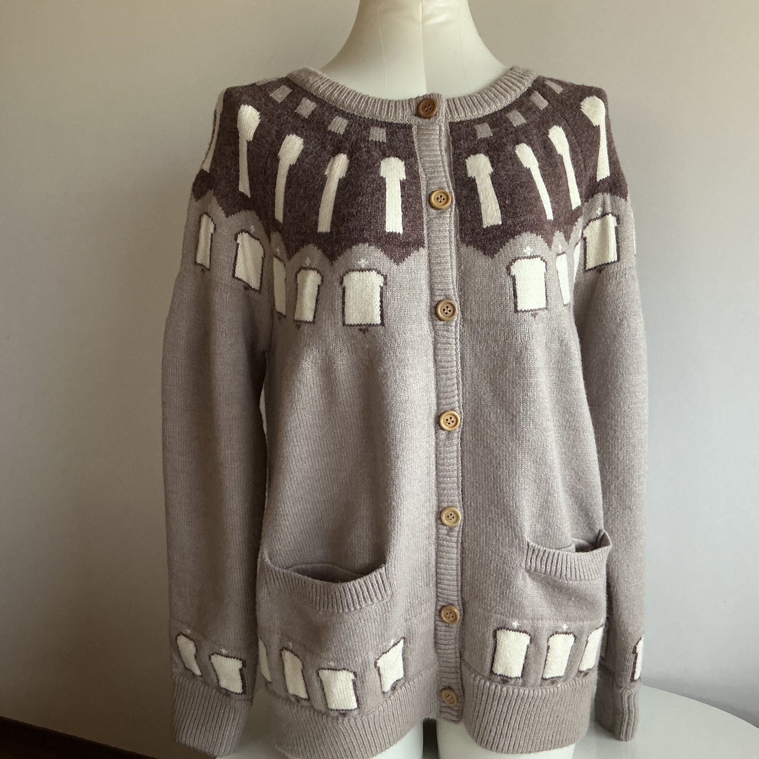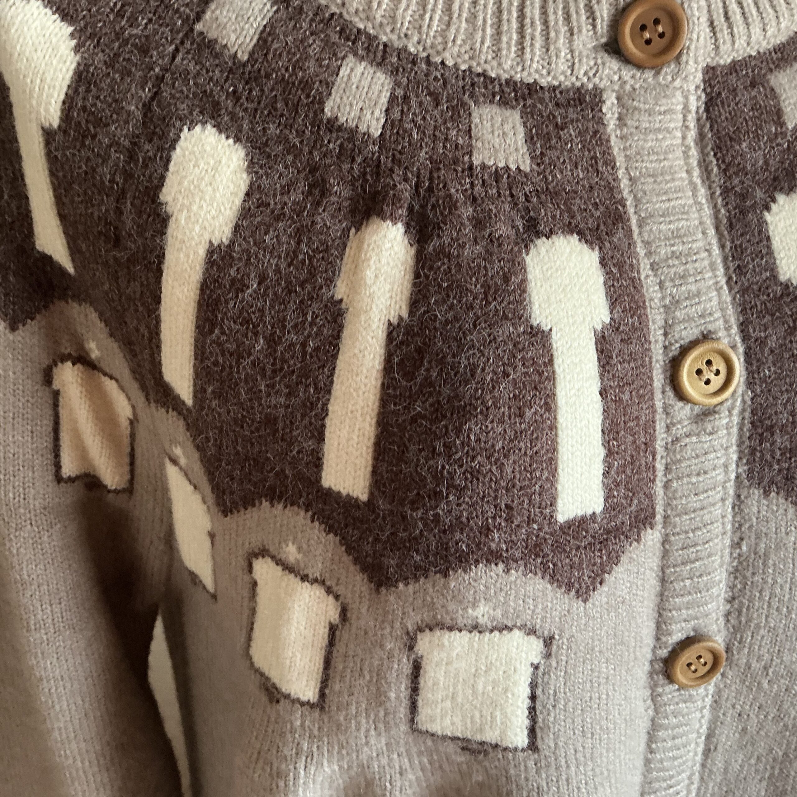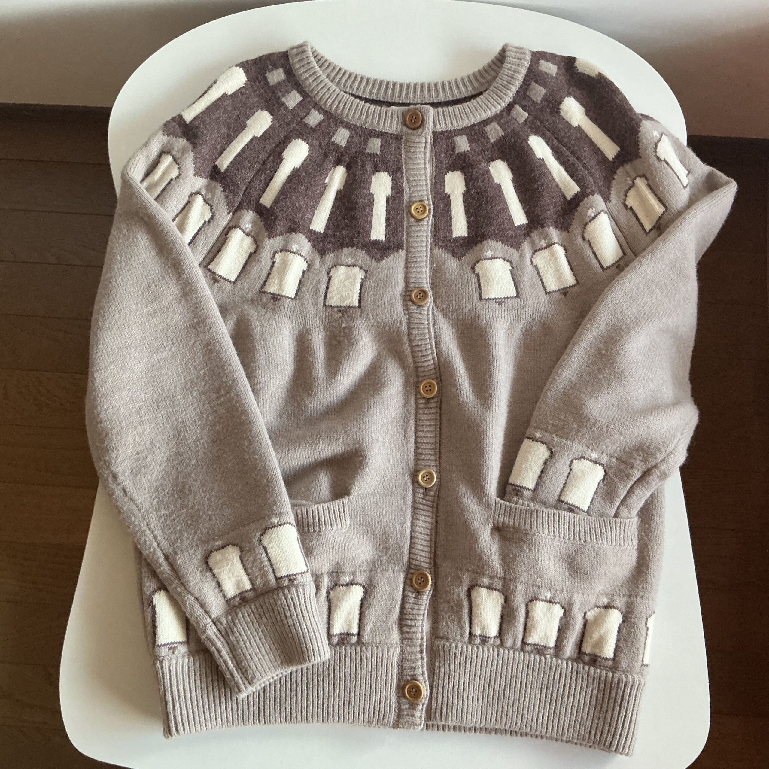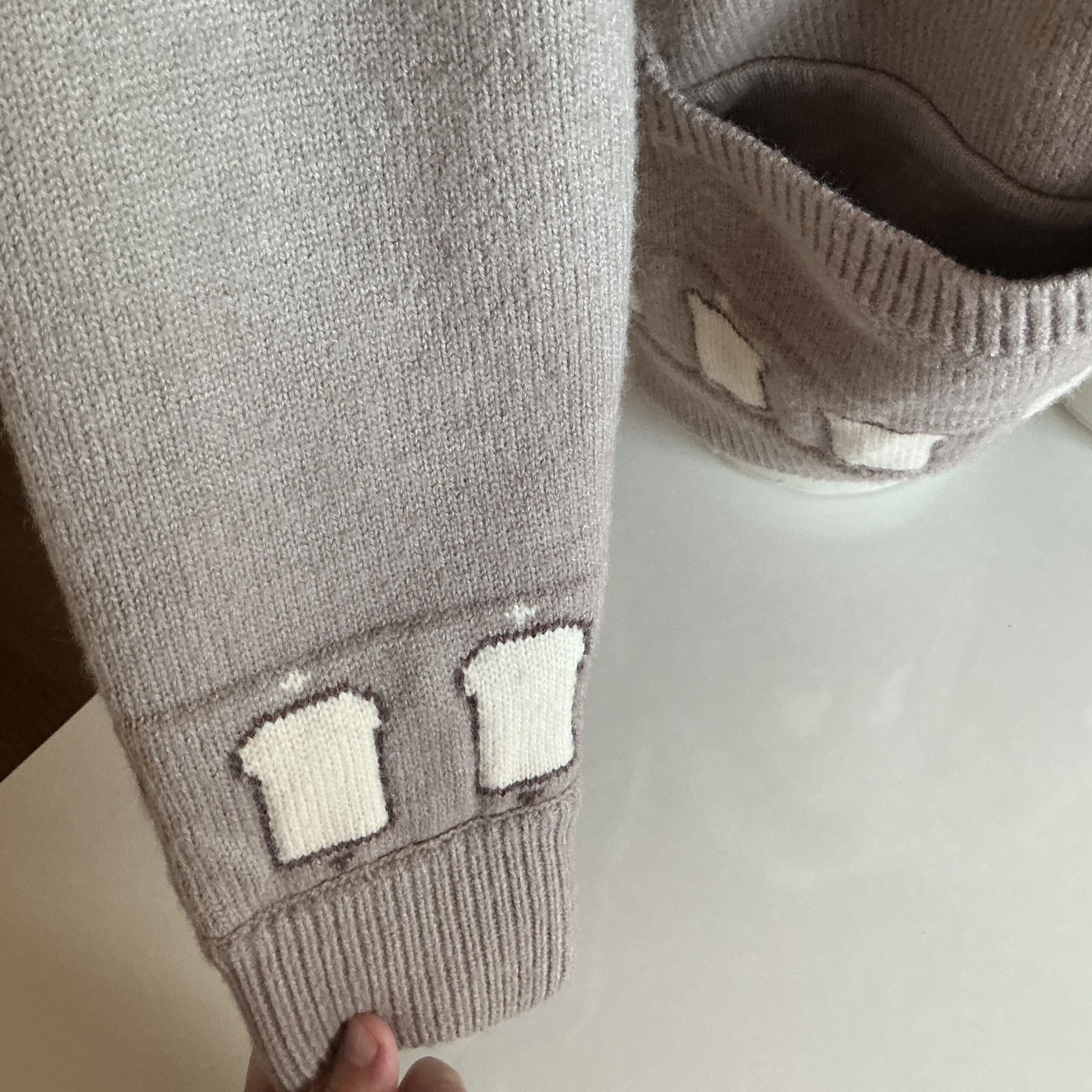 食パンモチーフがずらりと並んだほっこりニットのカーディガン。