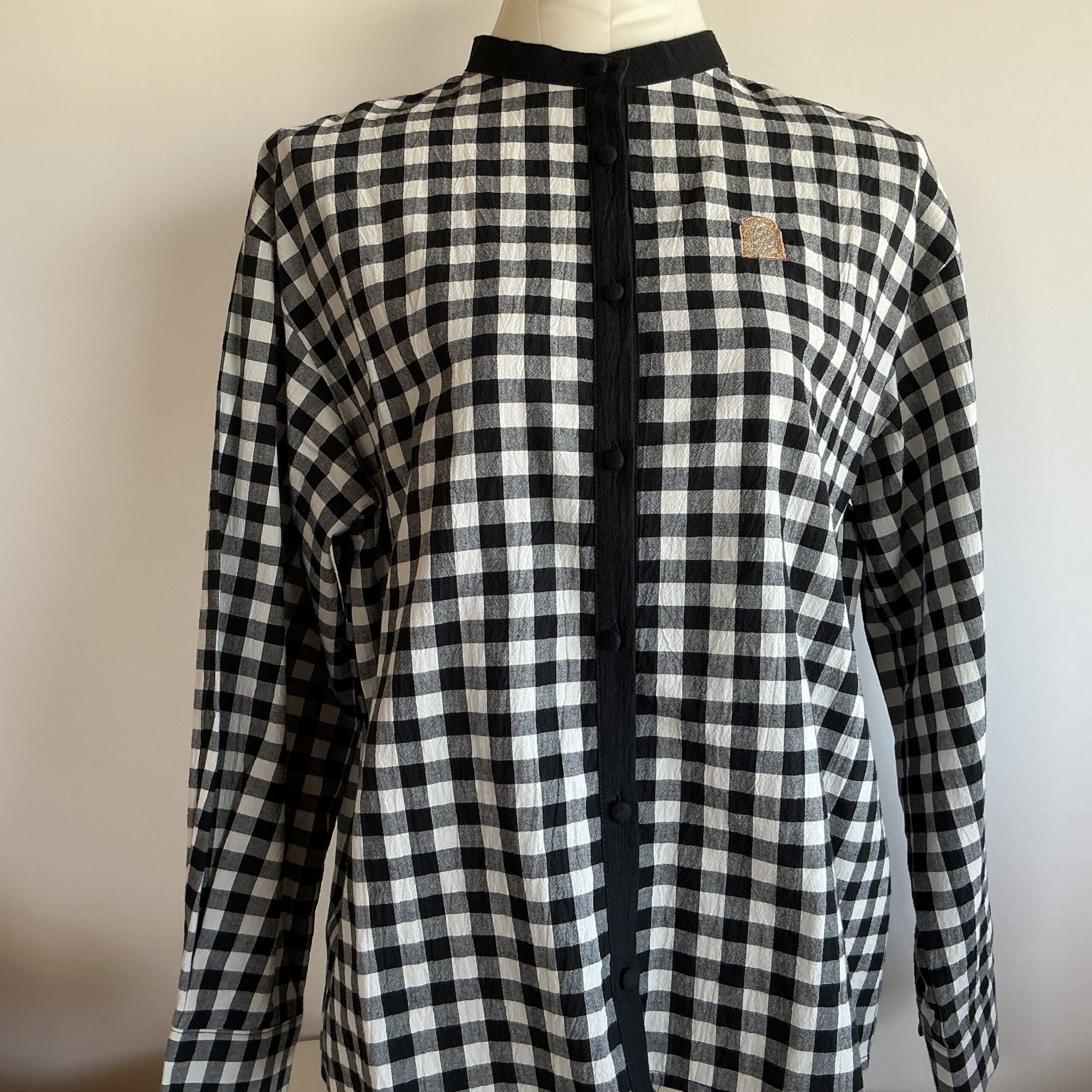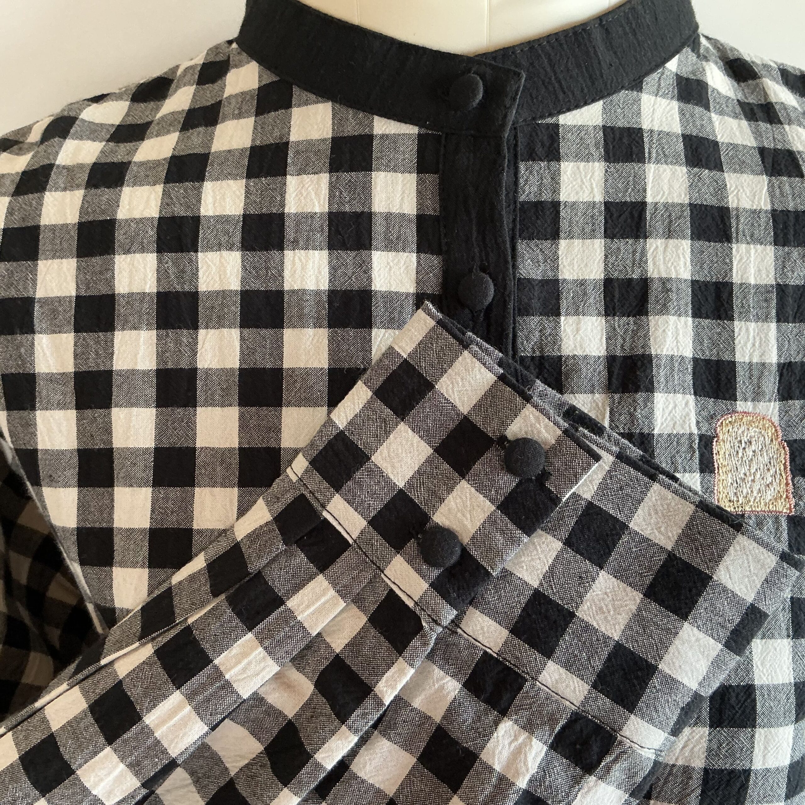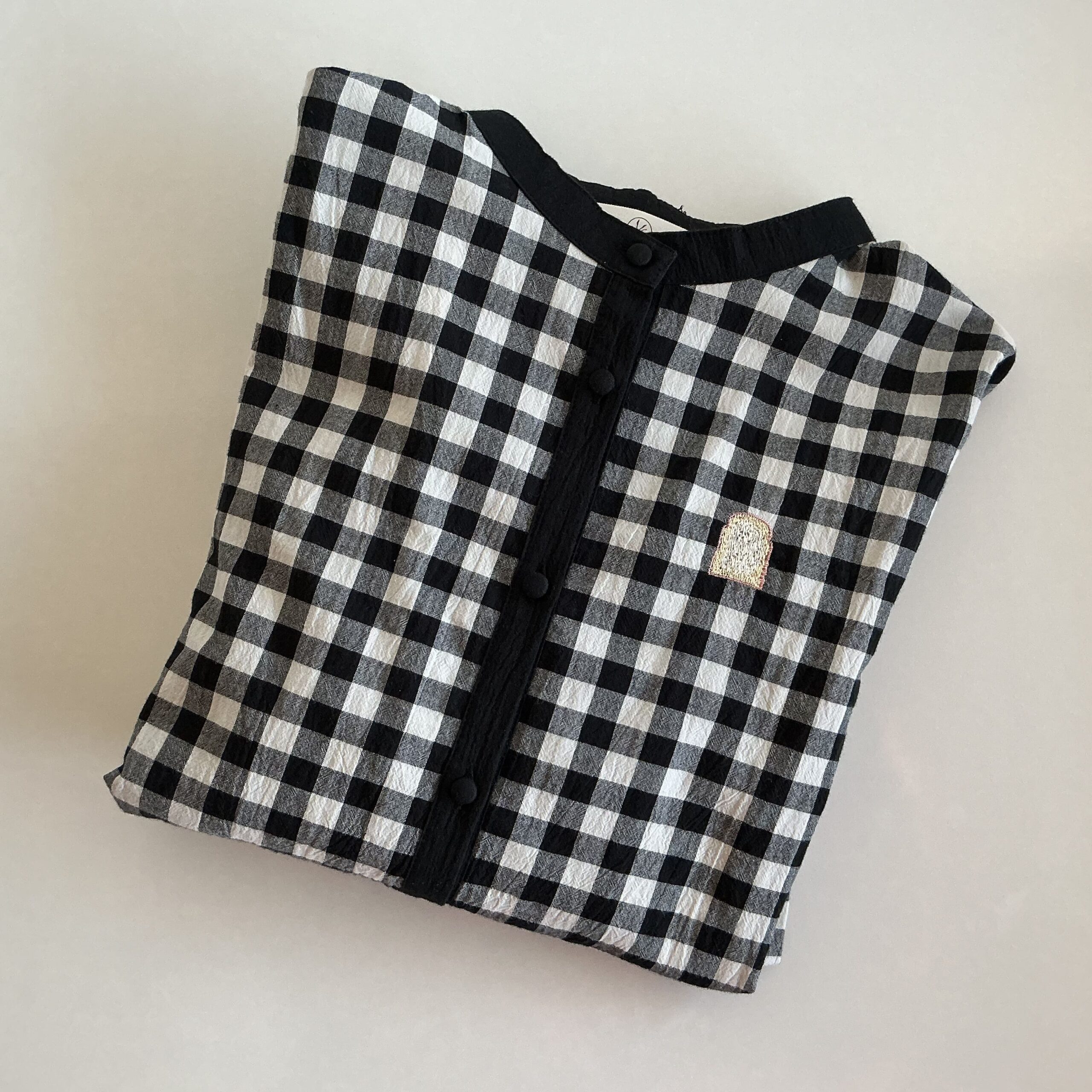 ブラックのギンガムチェックのシャツに、さりげないパン刺繍が素敵なのです。