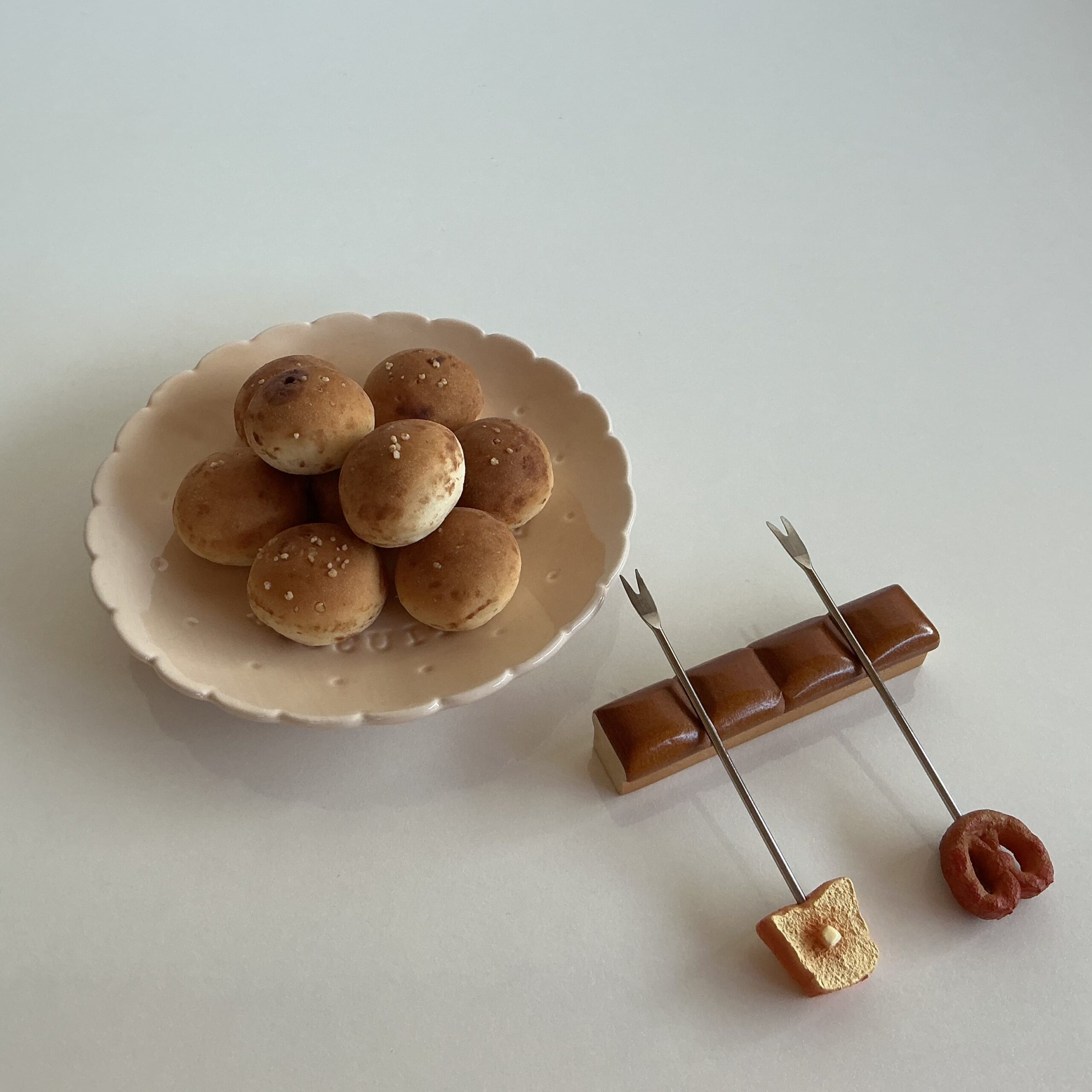 チョコあ〜んぱんの1口サイズ感が、ピックでプスっと刺すのに丁度良いのではと思い、お皿に盛りつけてみました。