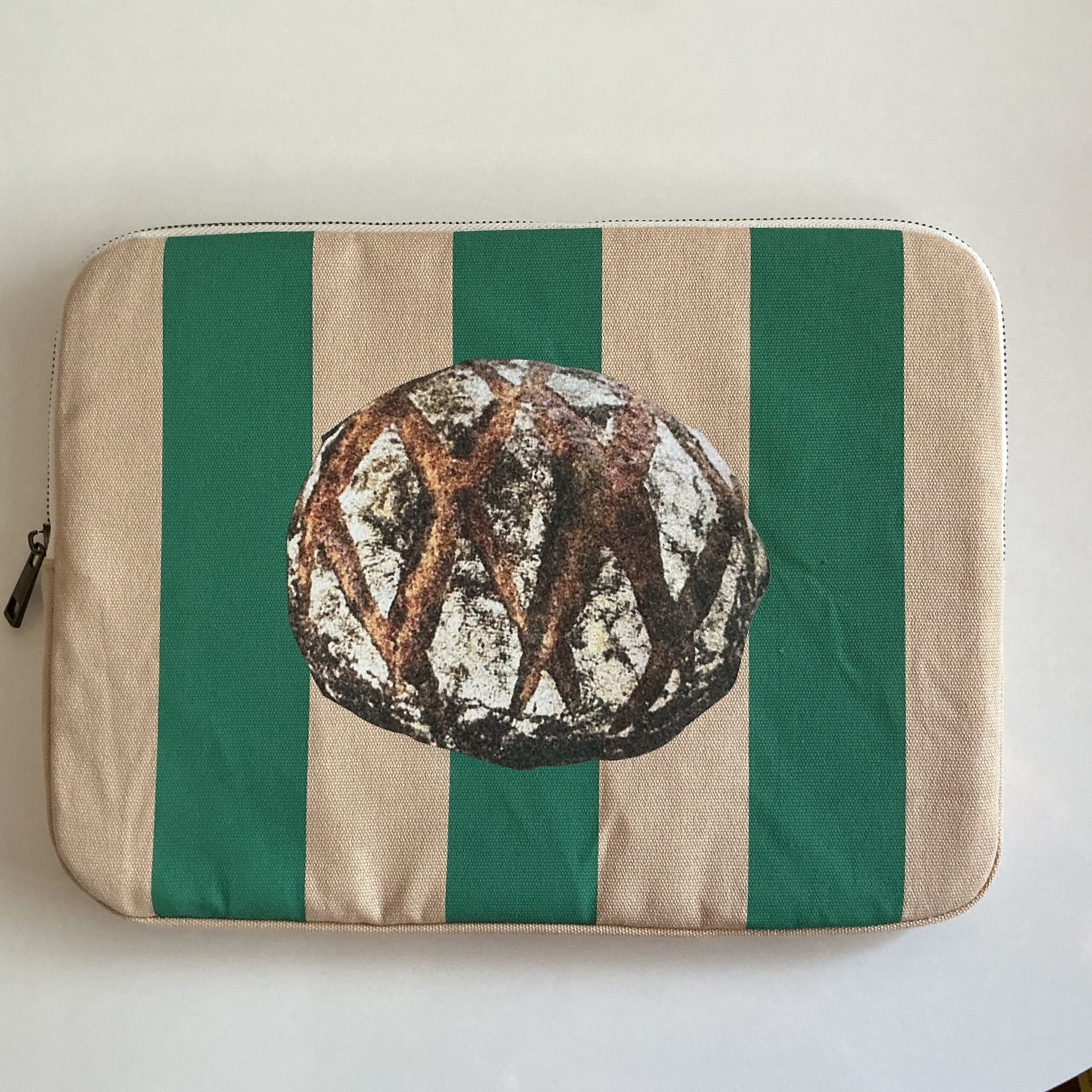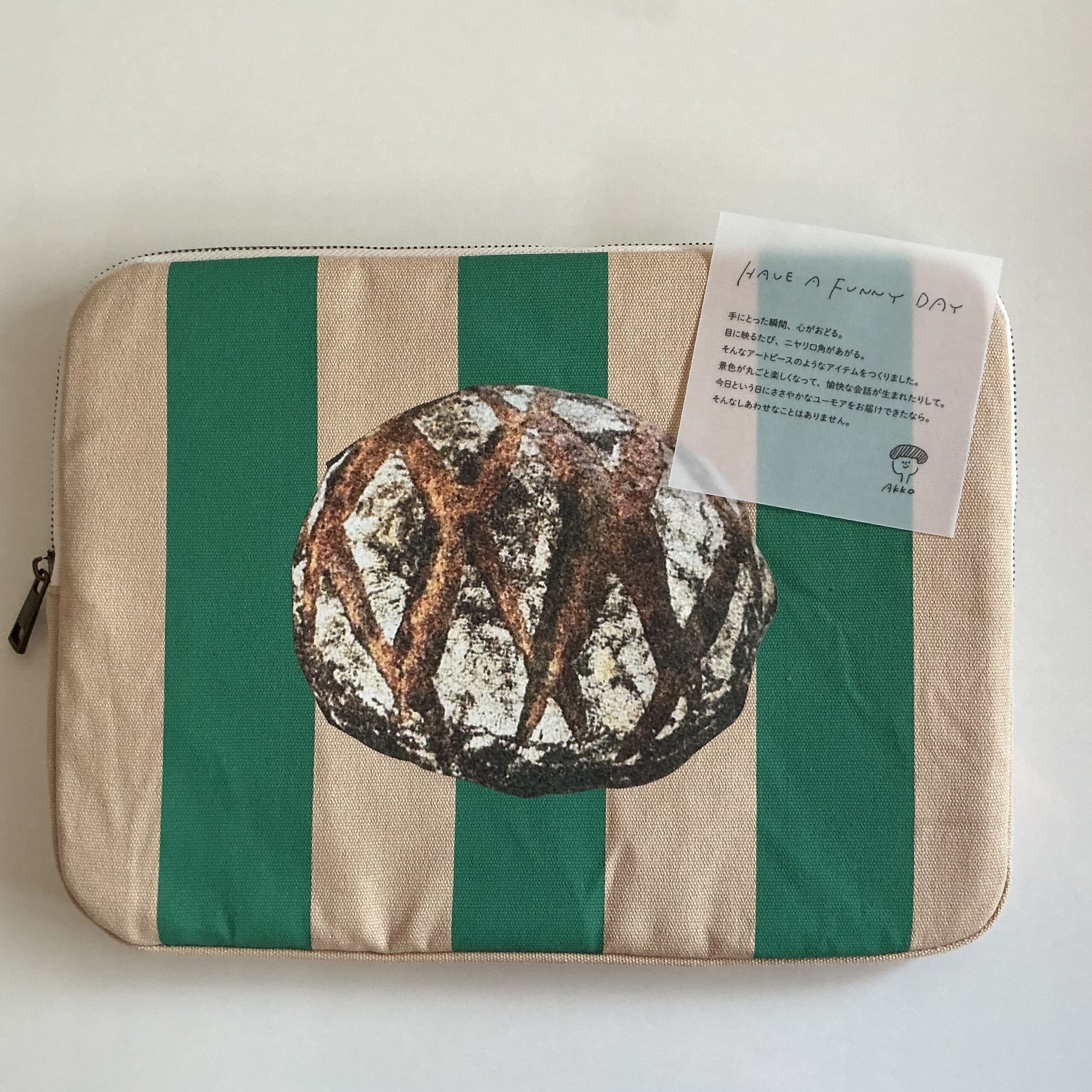 グリーンとベージュのストライプの配色に、ドーンとカンパーニュがプリントされていて、インパクトがあります。