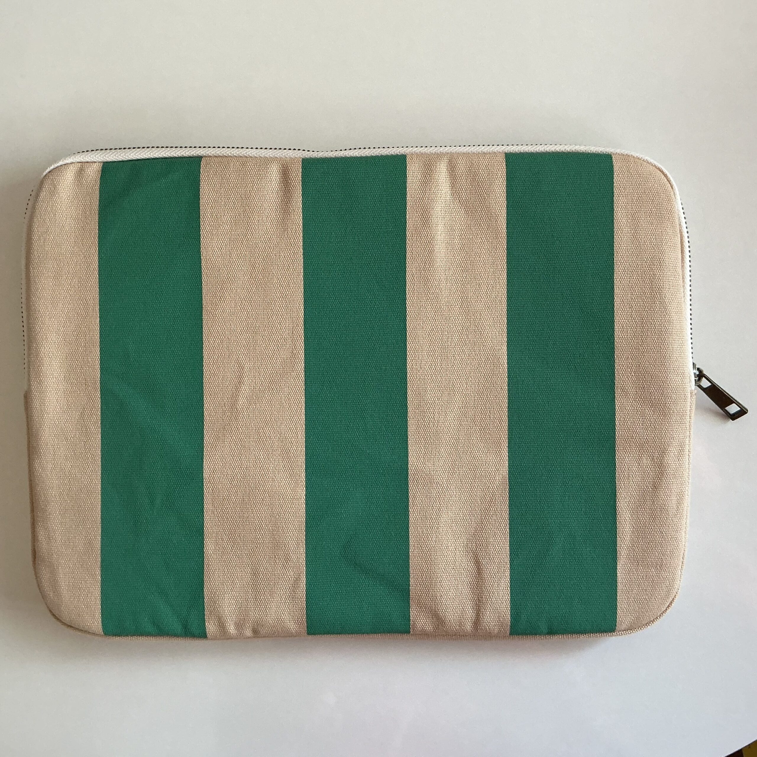 グリーンとベージュのストライプの生地は帆布素材で、少しざらっとした質感。
