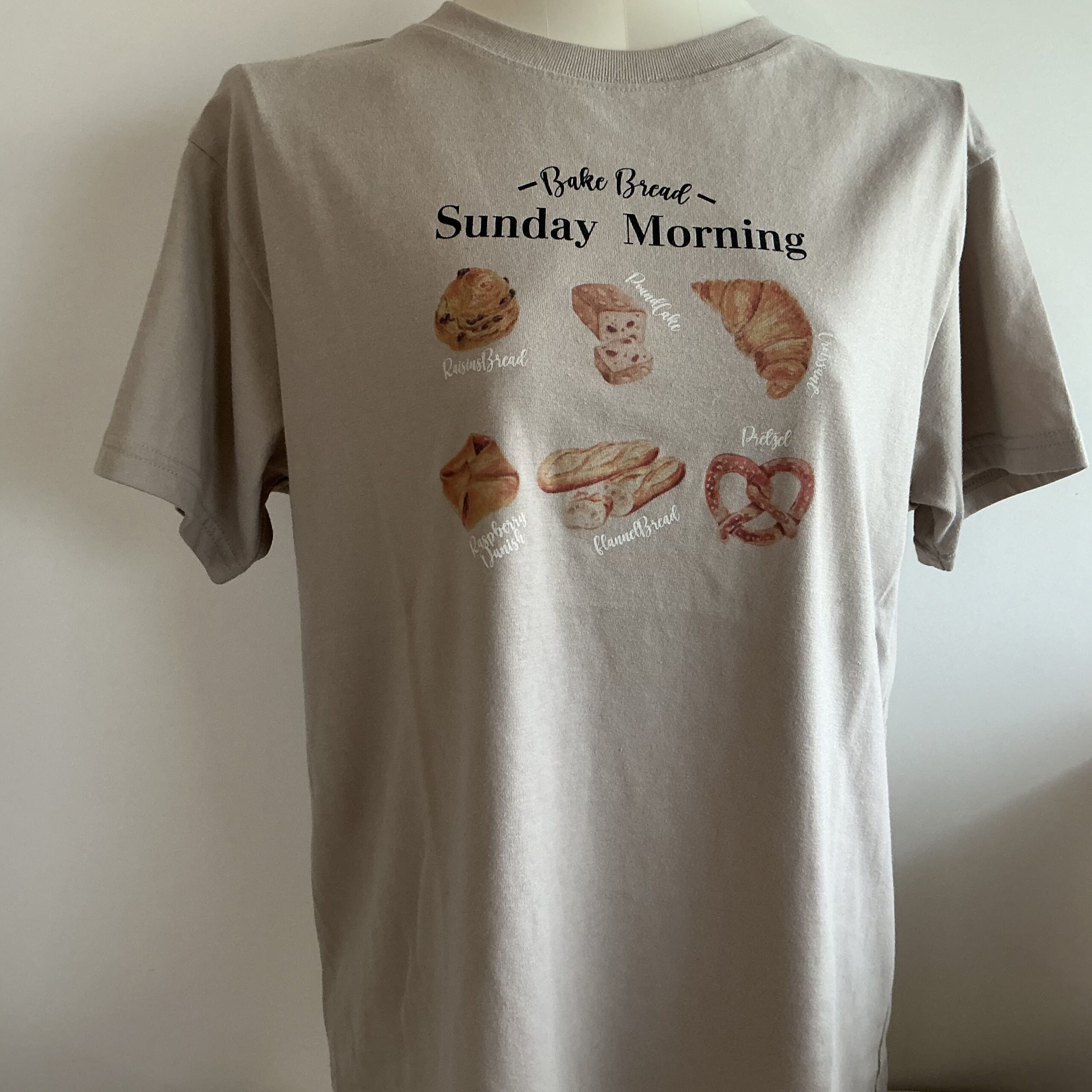 Sunday Morningのロゴの下にいろんなパンのイラストが描かれたTシャツ