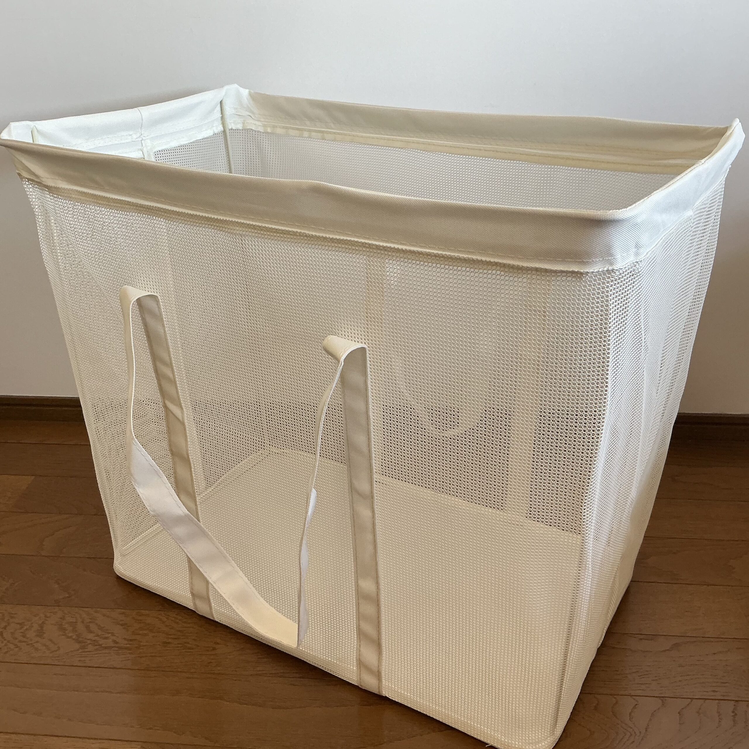 わたしが今、洗濯かご代わりに使っているのが、100円ショップでだいぶ前に購入したスクエア型のビニールバッグなのですが、