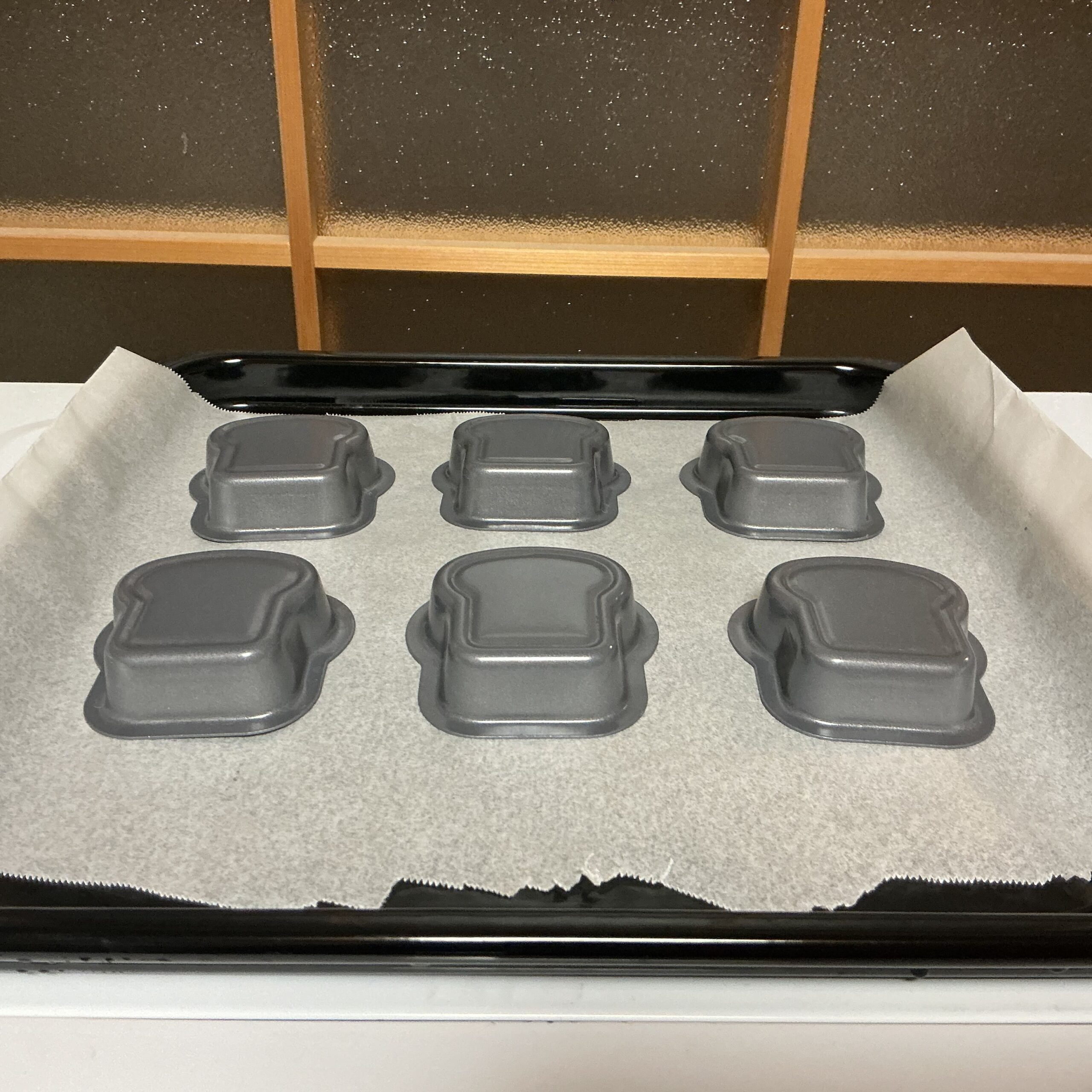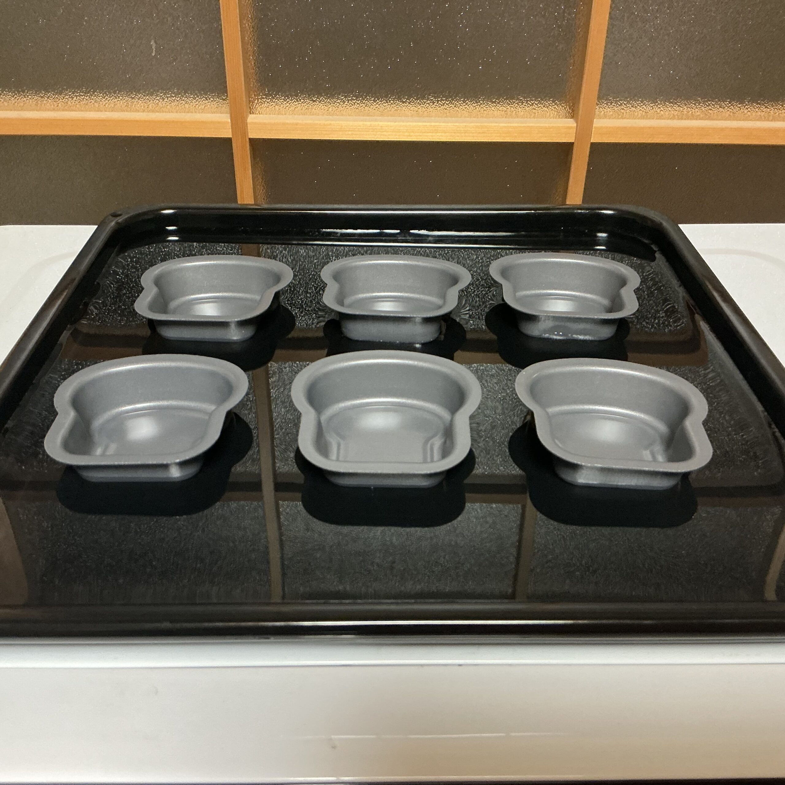 なぜか、「天板に水を張って焼くとふっくら仕上がる」というどこかで拾った知識が頭の中あったので、水を張った天板の上にお菓子型を並べていきます。