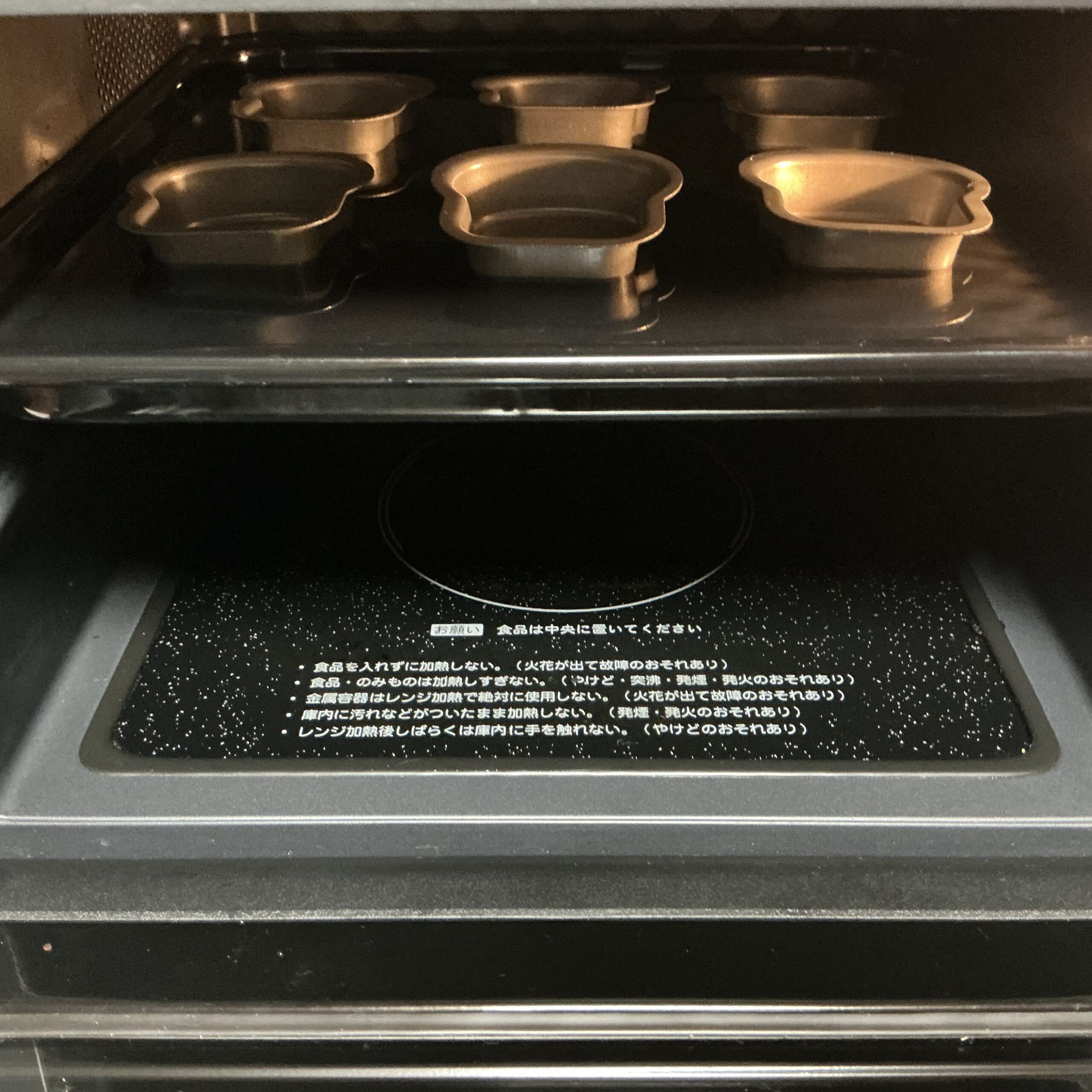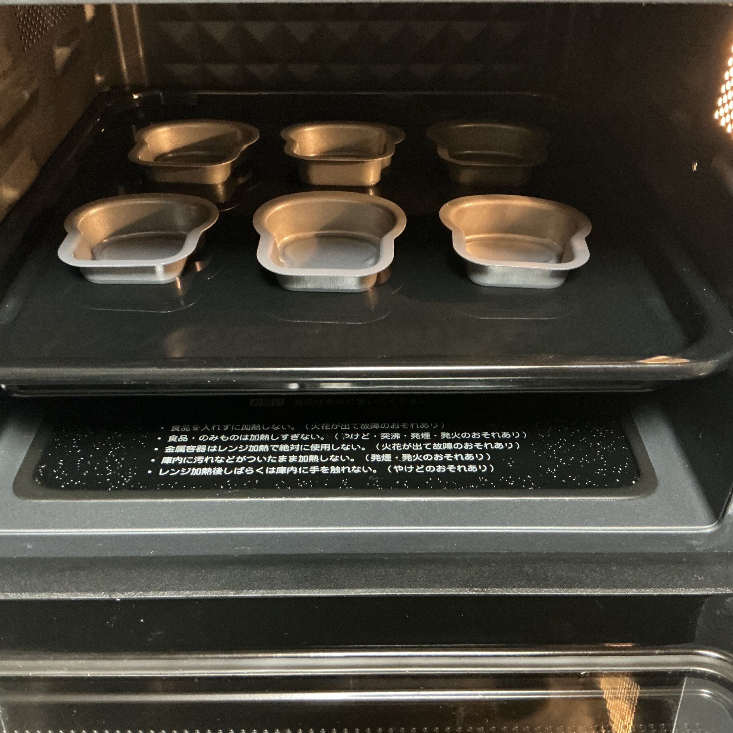 オーブンレンジの下の段にセットして、オーブンのケーキ機能にお任せして焼いていきます。